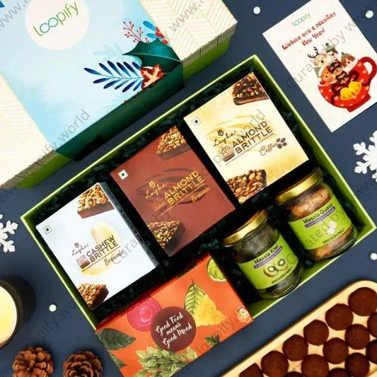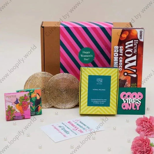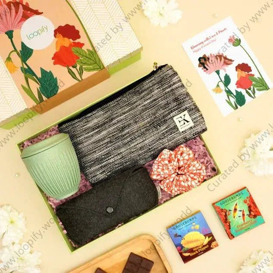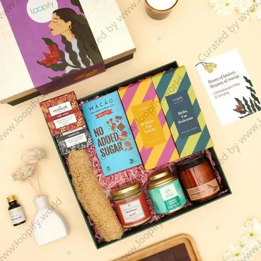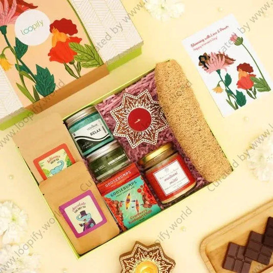 1 Reed Diffuser Vase 1 Sola Wood Flowers 1 Bottle of Essential Oil 1 Scented Soy Wax Candle in a Reusable Glass Jar 1 Jar of Natural Multani Mitti 2 Packs of Delectable Munchies 1 Date Sweetened Healthy Chocolate Bar 1 Natural Loofah | Made from Vegetable Husk 2 Luxury Bathing Bars 1 Tin of Organic Tea