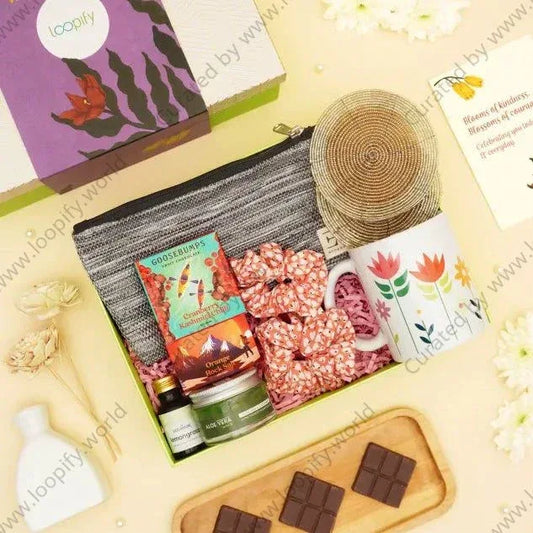 1 Reed Diffuser Vase 1 Sola Wood Flowers 1 Bottle of Essential Oil 1 Scented Soy Wax Candle in a Reusable Glass Jar 1 Jar of Natural Multani Mitti 2 Packs of Delectable Munchies 1 Date Sweetened Healthy Chocolate Bar 1 Natural Loofah | Made from Vegetable Husk 2 Luxury Bathing Bars 1 Tin of Organic Tea