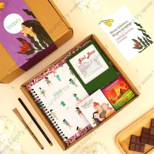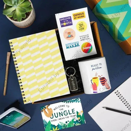 The Mini Workaholic Gift Set (₹950) Kraft notebook, metal pens, Blue Tokai Easy Pour coffee, granola, printed ceramic mug, greeting card. Productivity essentials that support focus and energy.