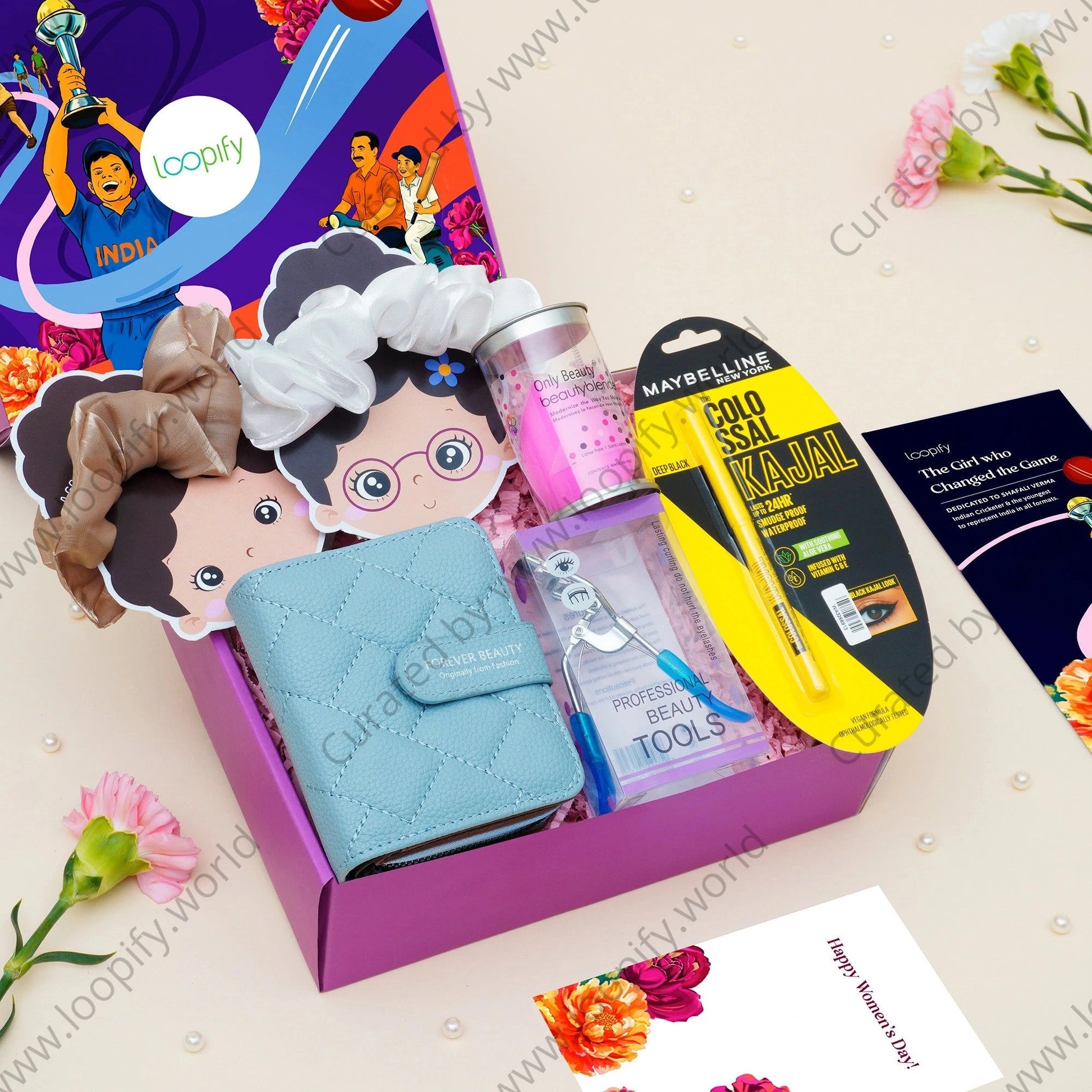 1 Iconic Maybelline Colossal Kajal 1 Super stylish vegan leather wallet 1 Beauty blender 1 Eyelash Curler 2 Pretty organza scrunchies 1 Printed flatbox 1 Women’s Day greeting card 1 Brochure with an inspiring Women’s Day story