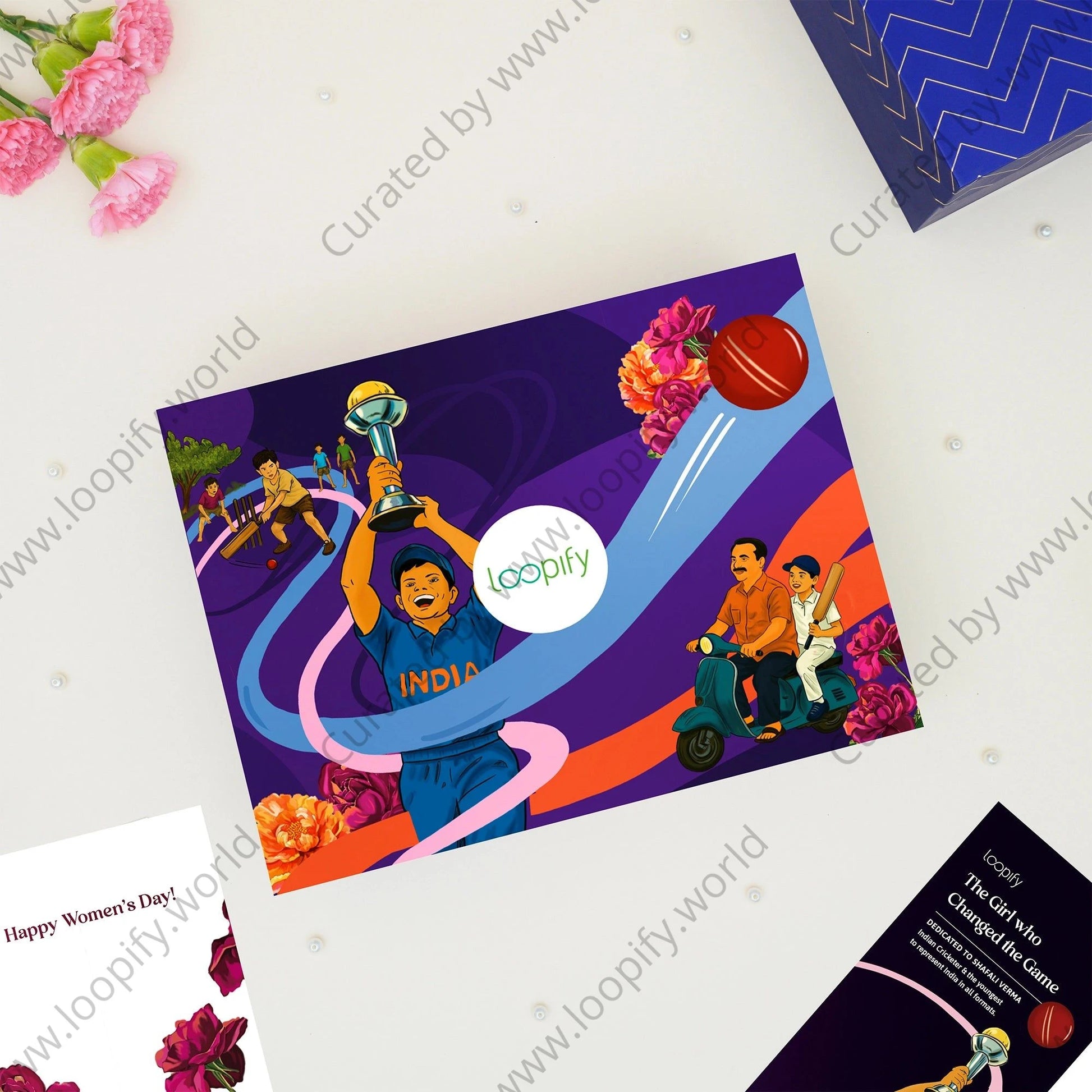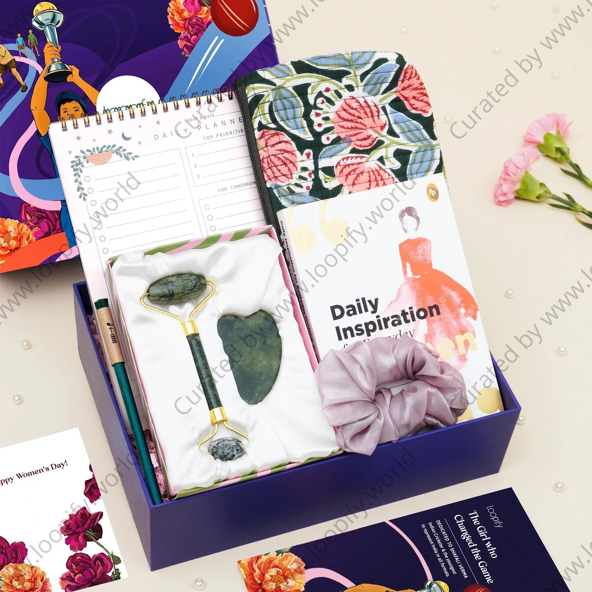 1 Inspirational book – Daily Inspiration for Everyday Women 1 Luxe jade roller & gua sha set 1 Beautiful multipurpose blockprint pouch 1 Pretty spiral bound daily planner 1 Plantable pen 1 Beautifully quirky EarPods case 1 Pretty organza scrunchie 1 Printed flatbox 1 Women’s Day greeting card 1 Brochure with an inspiring Women’s Day story