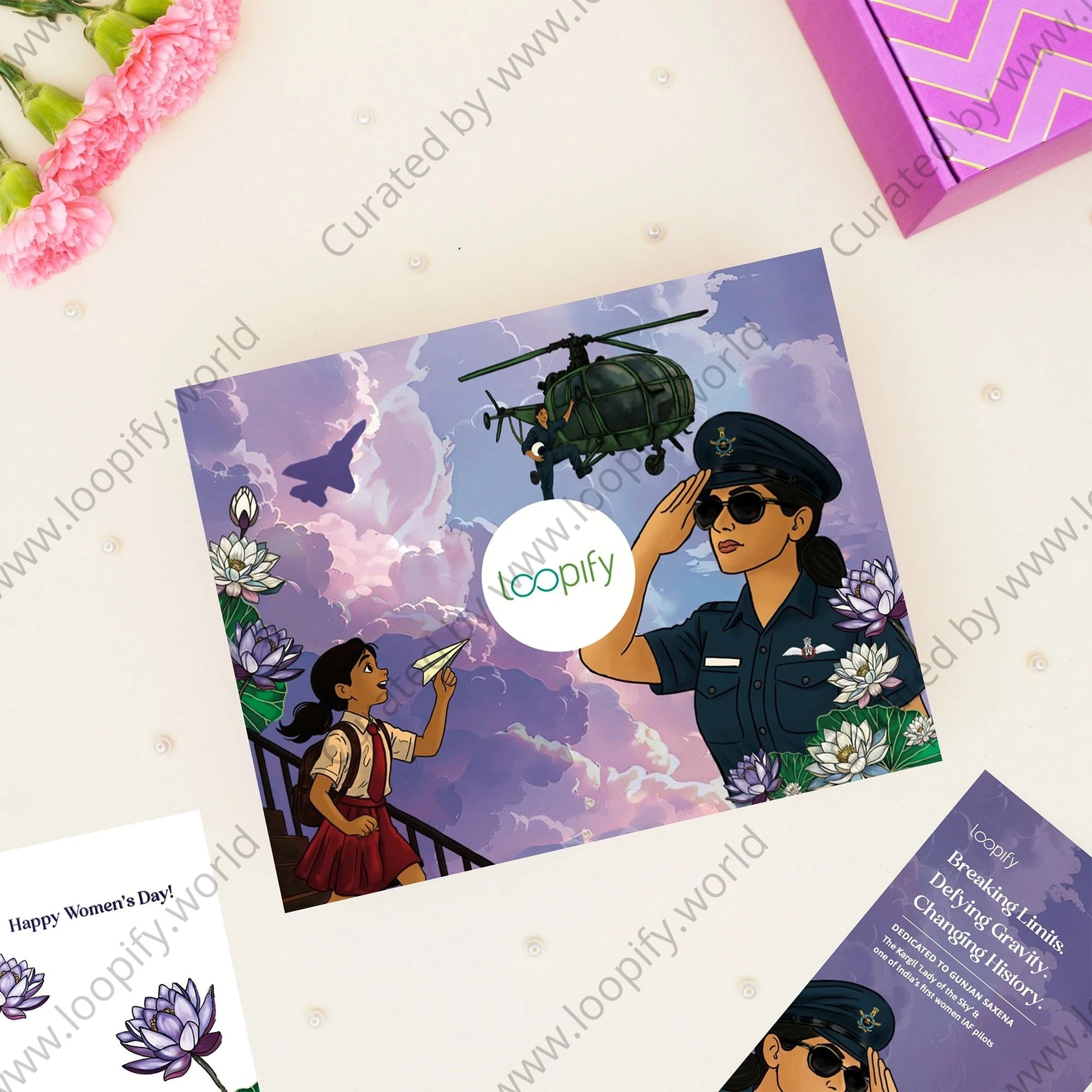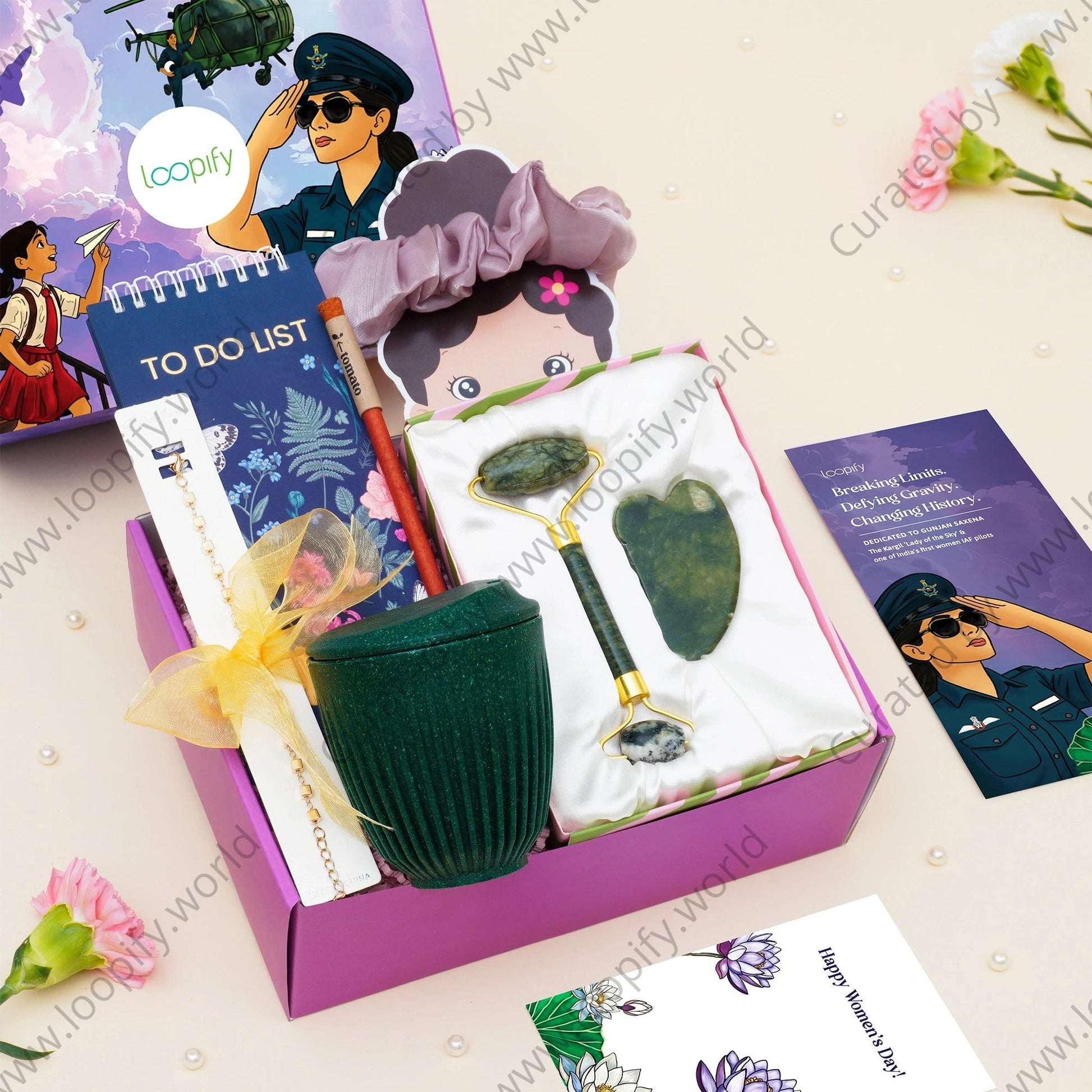 1 Luxe jade roller & gua sha set 1 Pretty to-do list 1 Plantable pen 1 Rustic 100% plastic-free coffee husk mug 1 Pretty organza scrunchie 1 Dainty bracelet 1 Printed flatbox 1 Women’s Day greeting card 1 Brochure with an inspiring Women’s Day story