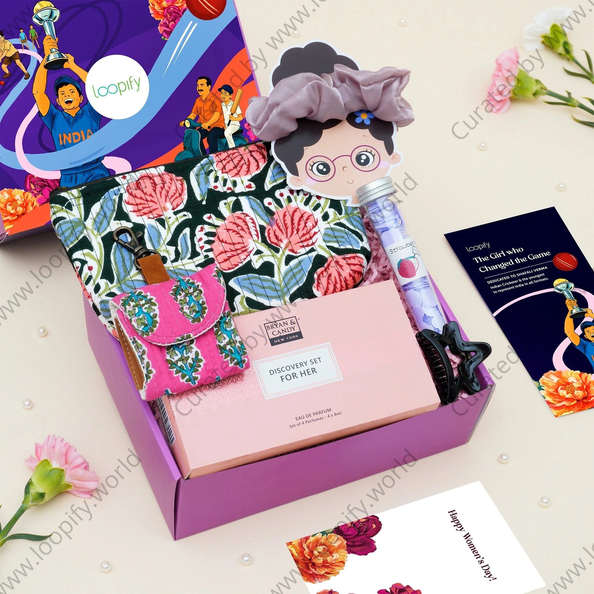 1 Set of 4 mini perfumes by Bryan & Candy 1 Beautiful, multipurpose blockprint pouch 1 Beautifully quirky blockprint EarPods case 1 Pretty organza scrunchie 1 Glass tube filled with paper soap 1 Trending claw-clip 1 Printed flatbox 1 Women’s Day greeting card 1 Brochure with an inspiring Women’s Day story